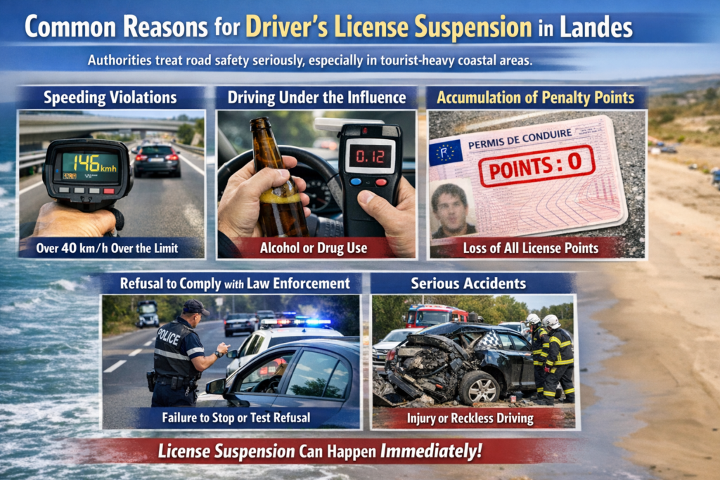 Several violations can lead to suspension in Landes. Authorities treat road safety seriously, especially due to heavy tourist traffic in coastal areas.